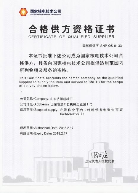 繼2010年我公司憑借強大實力成功擊敗多家國內(nèi)外知名公司,中標國家核電總公司AP1000浙江三門核電站,山東海陽核電站液壓升降機項目之后,2015年經(jīng)過精心準備,我公司又成功中標國家核電工程公司壓水堆示范工程項目CAP1400 1號、2號機組液壓升降平臺項目。